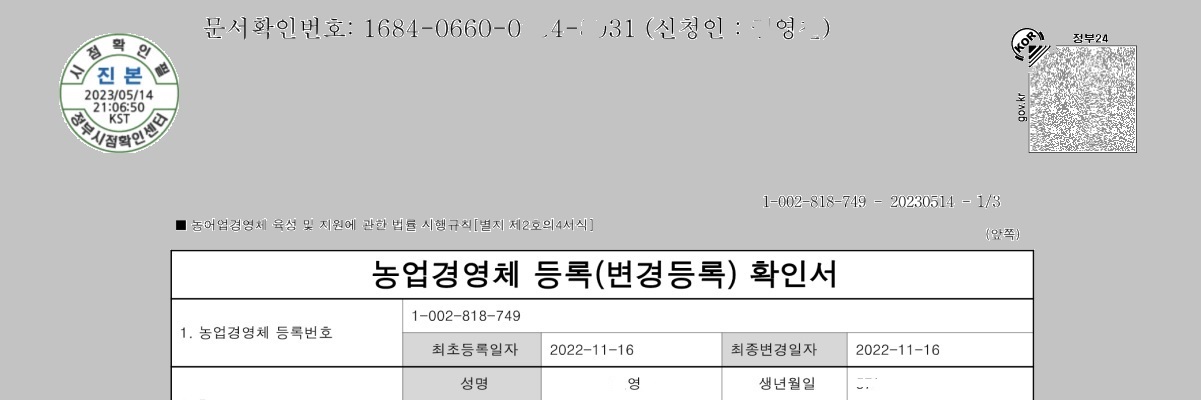 2022년 3월 초부터 홍천에 거주하며 농촌살기를 준비했다. 농사에 필요한 농자재를 구입하는 일부터 농업 관련한 기관에서 업무를 보는 일에 빠지지 않고 등장하는 것이 농업경영체를 등록했냐는 것이었다. 농업경영체 등록을 하지 않고는 농촌에서 살기 힘들다는 느낌을 받을 정도로 빈번히 부딛는 단어다. 대체 농업경영체가 무었이길래 이러는 것일까? 농업경영체 등록 요건은 1000m2 이상의 농지에 실제 경작을 하고 있는 경우다. 농지는 소유이거나 임대도 가능하다. 농지는 면행정복지센터에 1) 농지대장 등록을 해야 한다. 그 후 작물을 심고 나서 농산물품질관리원에 2) 농업경영체 등록을 할 수 있다.