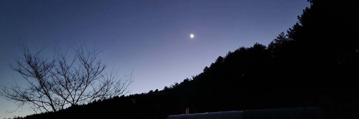 도심에서는 볼 수 없는 별들이 검은 하늘에 선명하고, 산등성이로 초승달이 걸렸다. 혼자 걷는 호젓한 밤길에 어릴 적 고향의 달 밝은 밤이 눈앞에 있다.